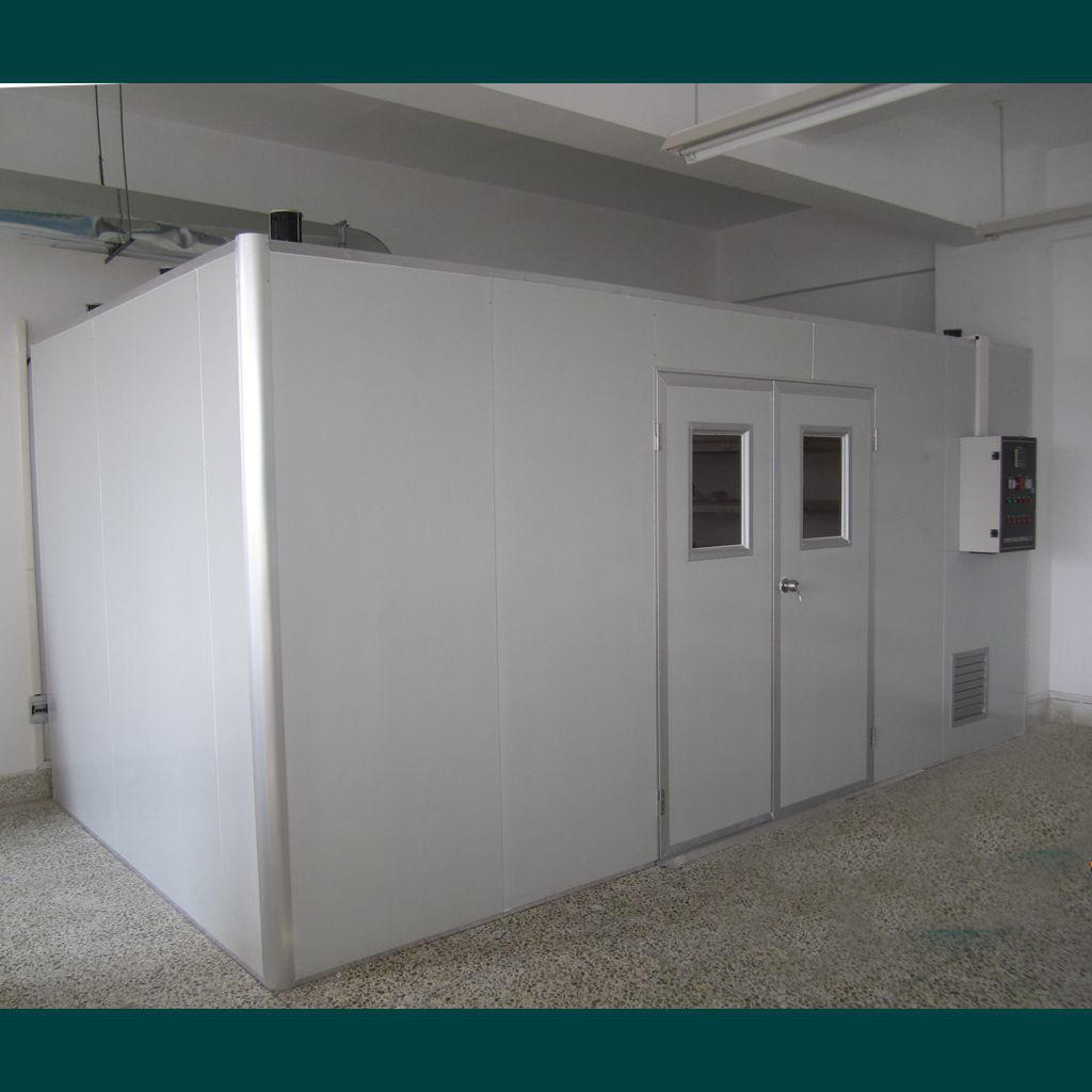 房體結(jié)構(gòu):高溫老化房房體結(jié)構(gòu)一般采用保溫板(雙面彩色鋼板,中間必須是巖棉)在現(xiàn)場拼裝而成,房間尺寸均根據(jù)客戶要求設(shè)計。整個房間外表美觀,結(jié)構(gòu)牢固,同時安裝方便快捷,施工期短。在房間墻上,根據(jù)需要可設(shè)置觀察窗,方便在室外觀察到室內(nèi)產(chǎn)品測試情況。在墻上還配有不同電壓的插座,以滿足產(chǎn)品老化測試時的需要。